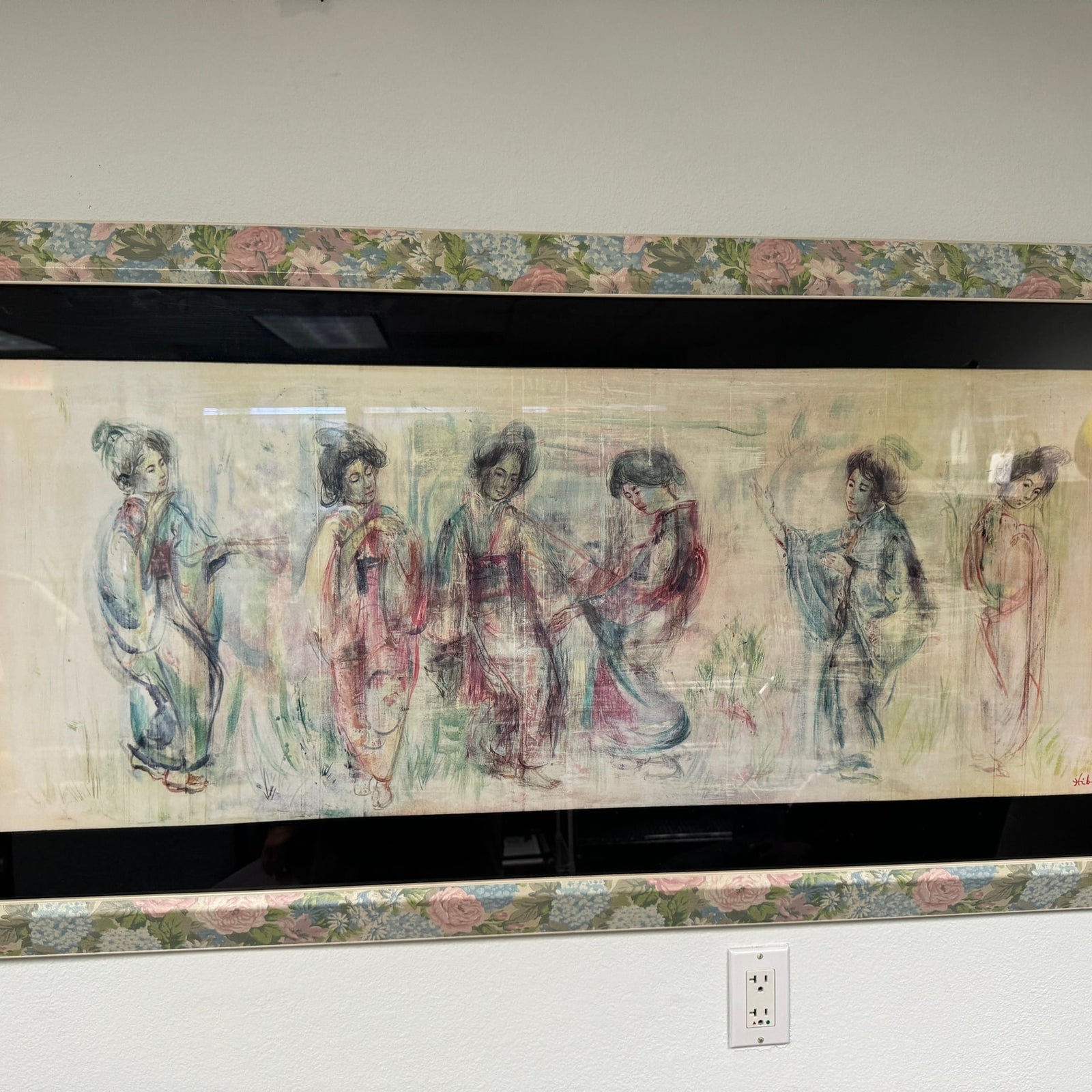 Exquisite Framed Reproduction Lithograph of Edna Hibel's "Oriental Dancers" Oil Painting. This piece beautifully captures the grace and movement of the dancers in soft, harmonious colors. The lithograph is housed in a unique frame featuring a floral pattern, complementing the artwork's delicate aesthetic. This piece is in excellent condition, ready to be a focal point in any art collection or living space. Perfect for admirers of Hibel's work or those seeking a touch of elegant, Eastern-inspired art for their home decor.