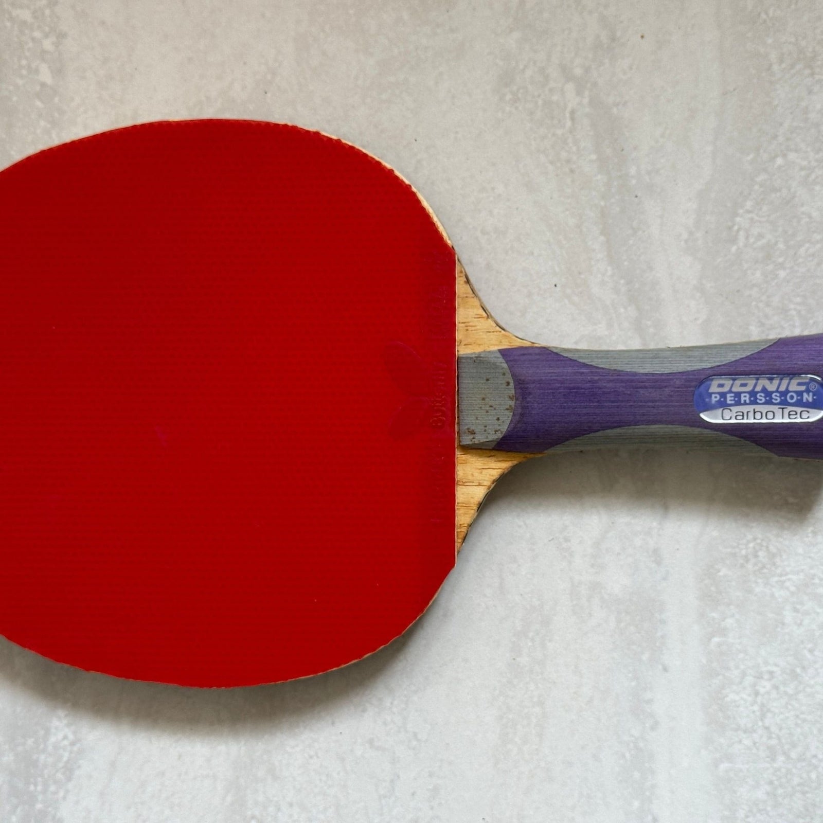 Used Donic Persson CarboTec 700 Table Tennis Paddle. Good used condition, with some wear on the handle and edges of the paddle as seen in photos. The red rubber pad is clean and still has good grip. Perfect for players looking for a quality used paddle to enhance their game.