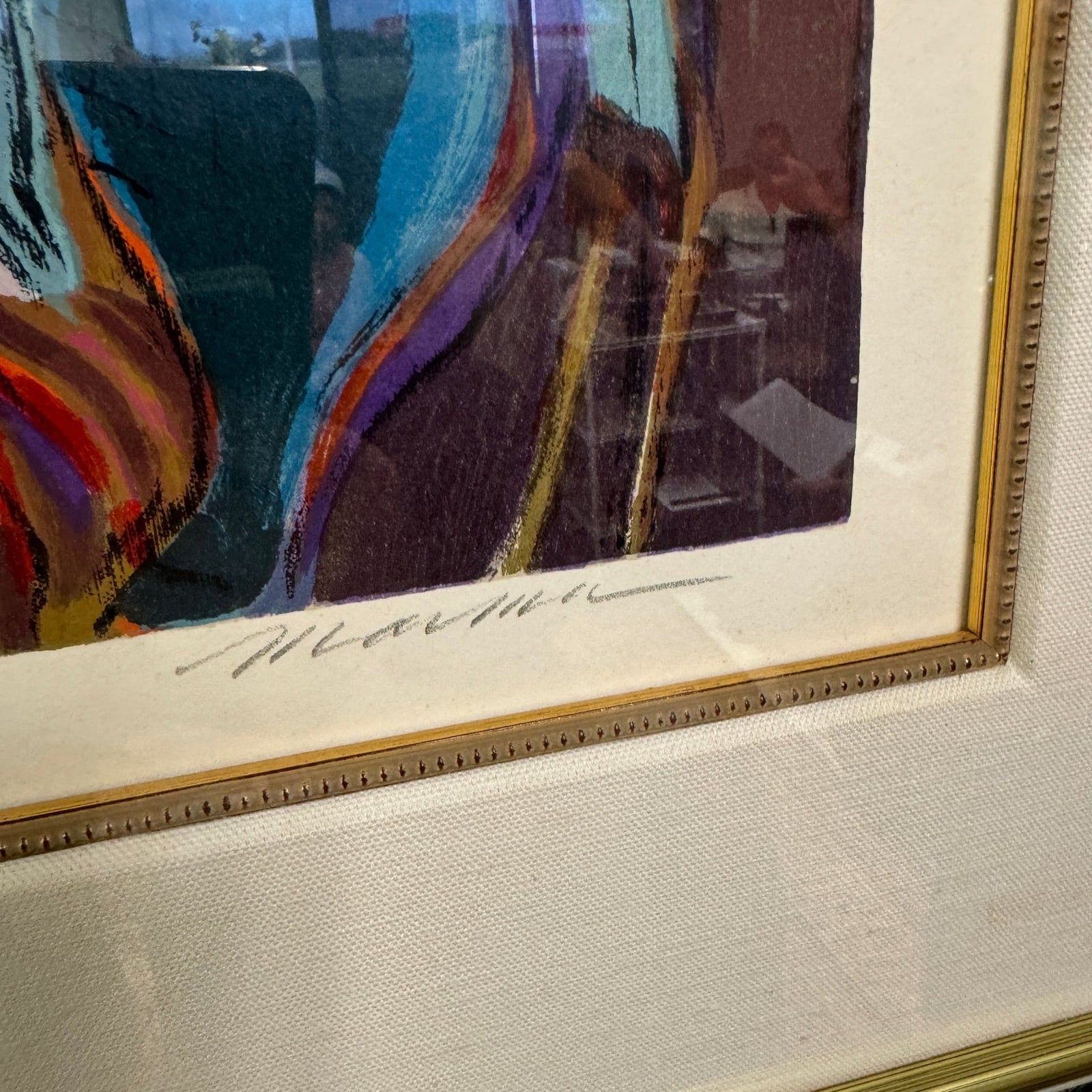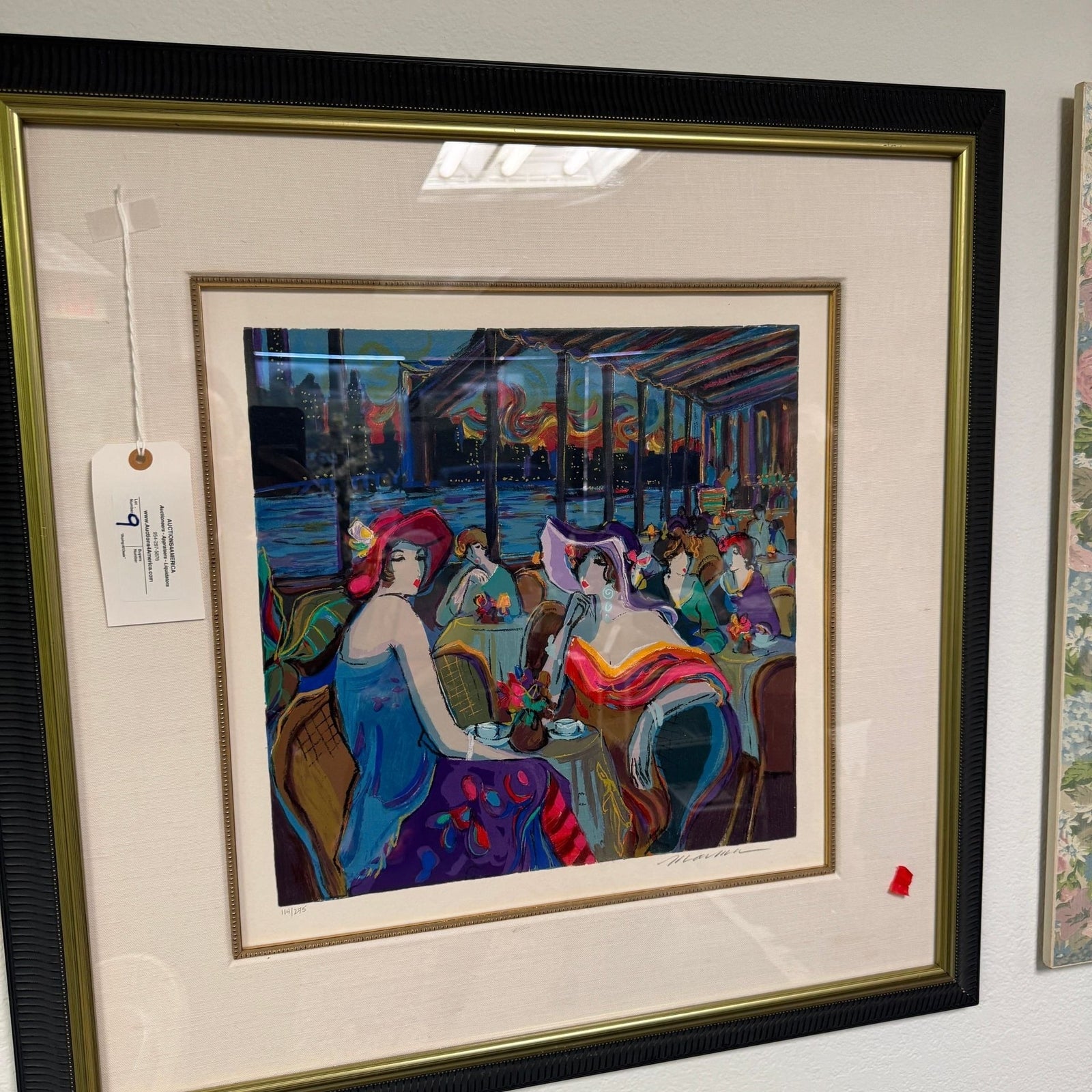 Colorful limited edition framed art print depicting a vibrant scene at New York City's River Cafe. This framed print captures the essence of a lively gathering, with women in fashionable hats enjoying tea by the water, overlooking the twinkling city lights. The art is signed Marlene and numbered 117/295. This piece is in excellent condition, ideal for adding a touch of elegance and visual interest to any space. It