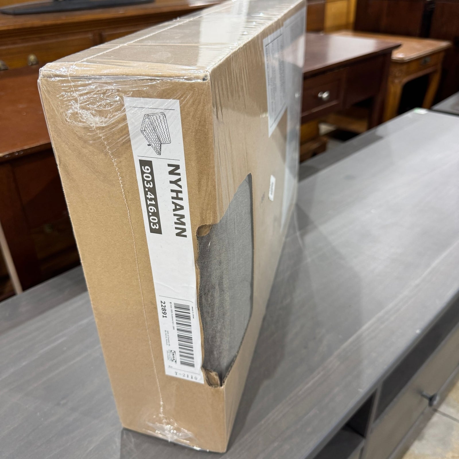 New in box IKEA NYHAMN sofa-bed cover in grey. This cover is designed to fit the NYHAMN sofa-bed frame, bringing a fresh look to your living space. The grey color offers a versatile and sophisticated aesthetic. Easy to install and care for, this cover can extend the life and style of your sofa. This item is new and sealed in its original packaging.