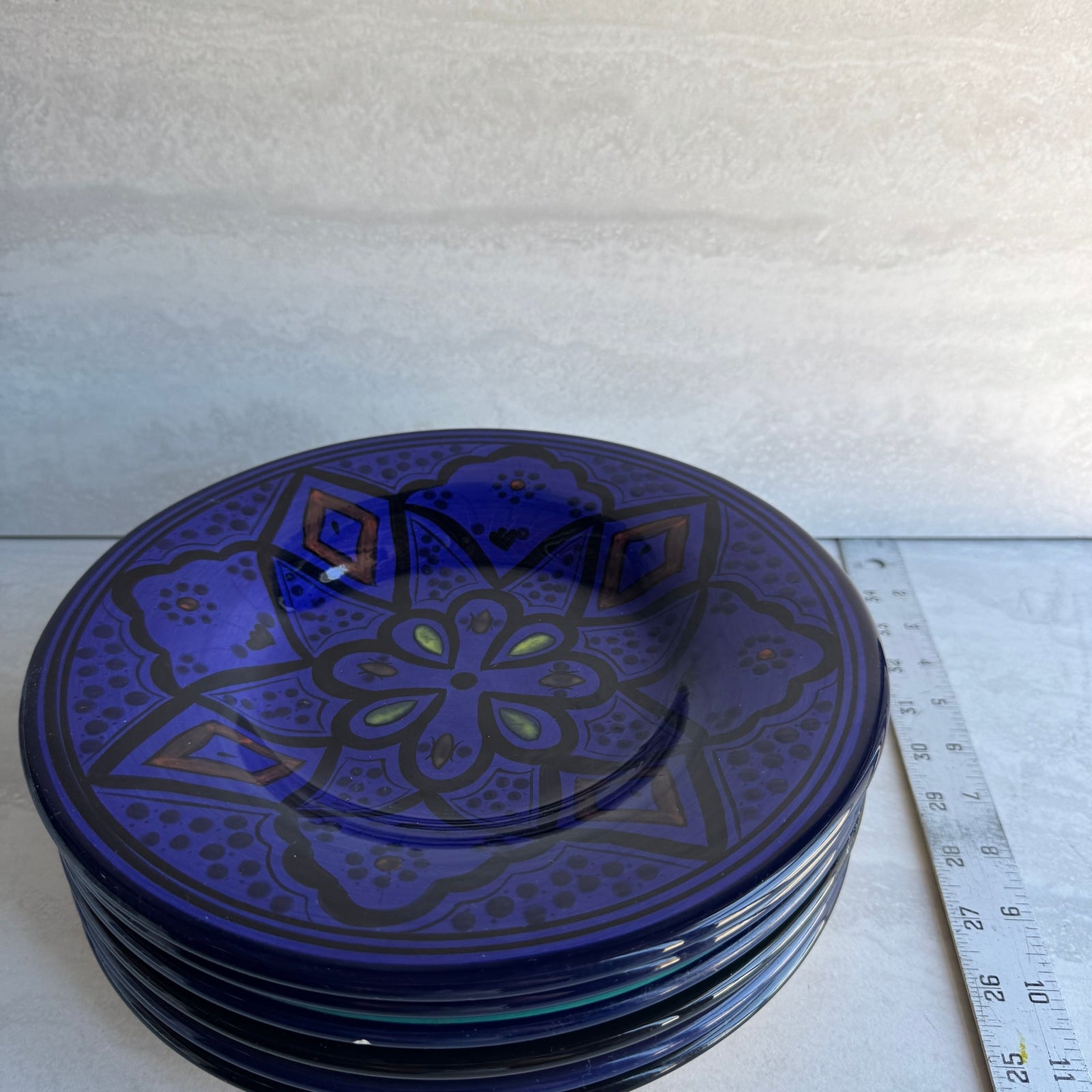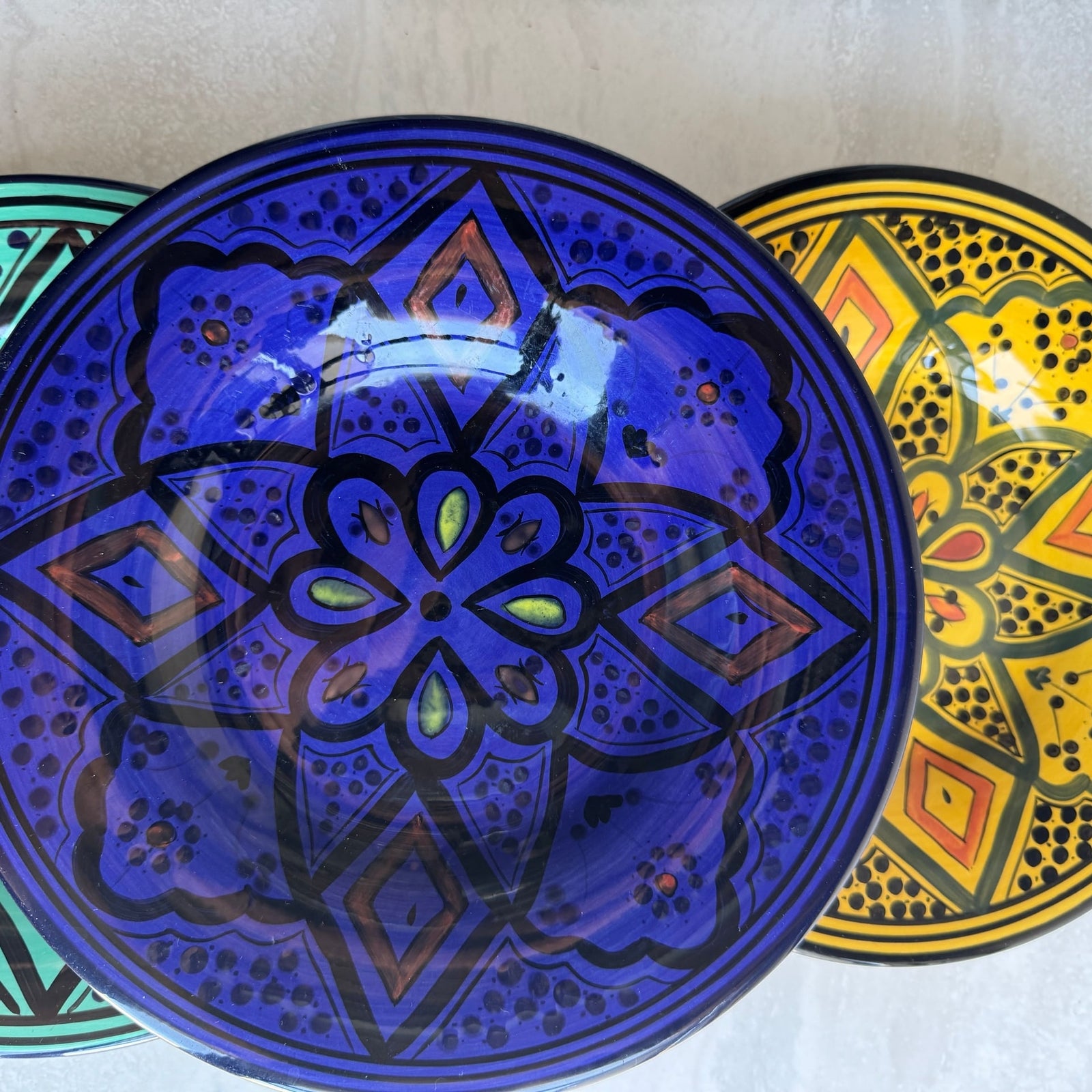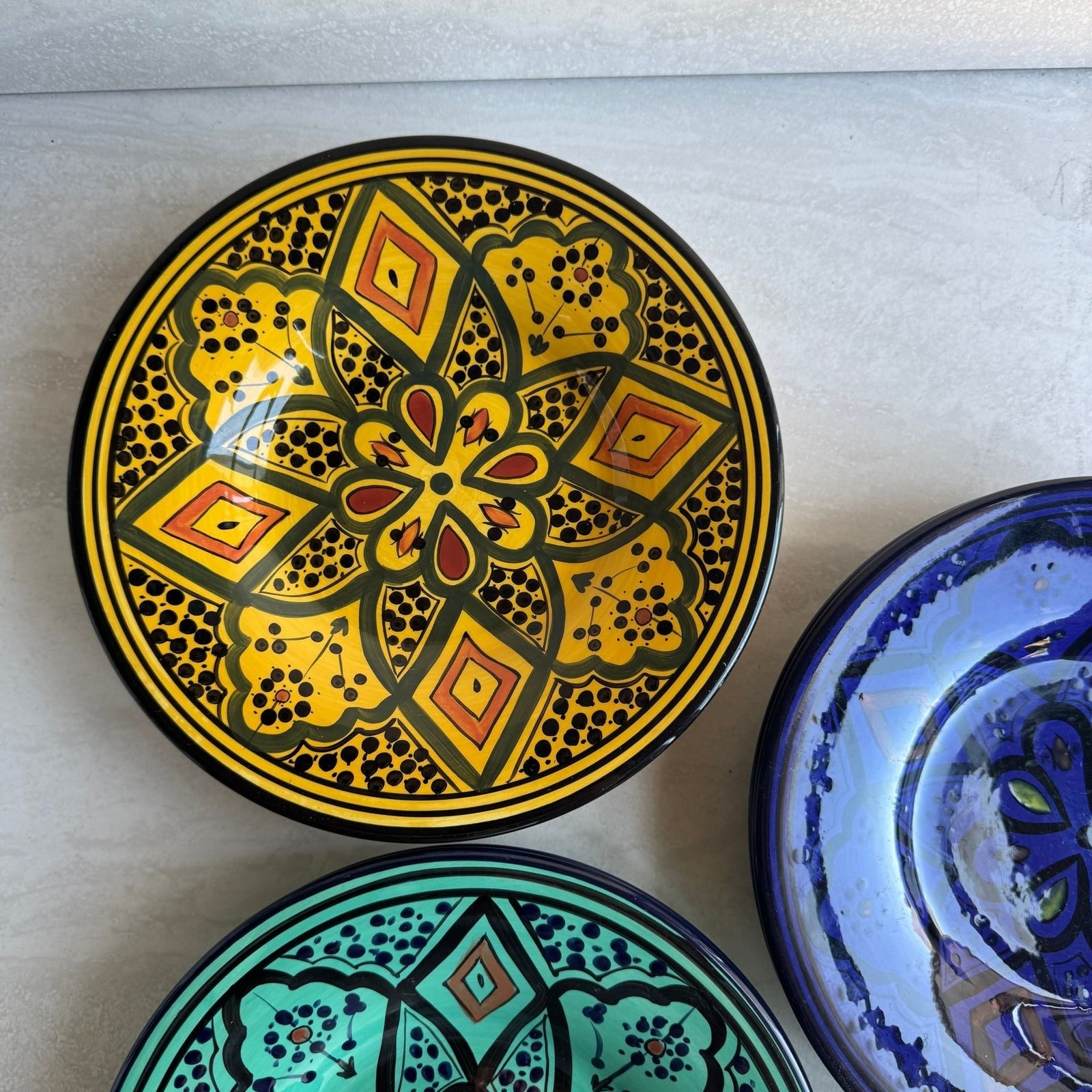 This is a beautiful set hand-painted ceramic bowl, featuring vibrant yellow, green blue, black, and red colors with a striking geometric and floral pattern. This decorative piece can be used as a serving dish or as an accent piece in any room. It is in excellent pre-owned condition with no chips or cracks (one of the 6 plates has a small chip as you can see in the picture. Originating from Morocco, this unique item adds a touch of bohemian flair. Sold as a set of 6.