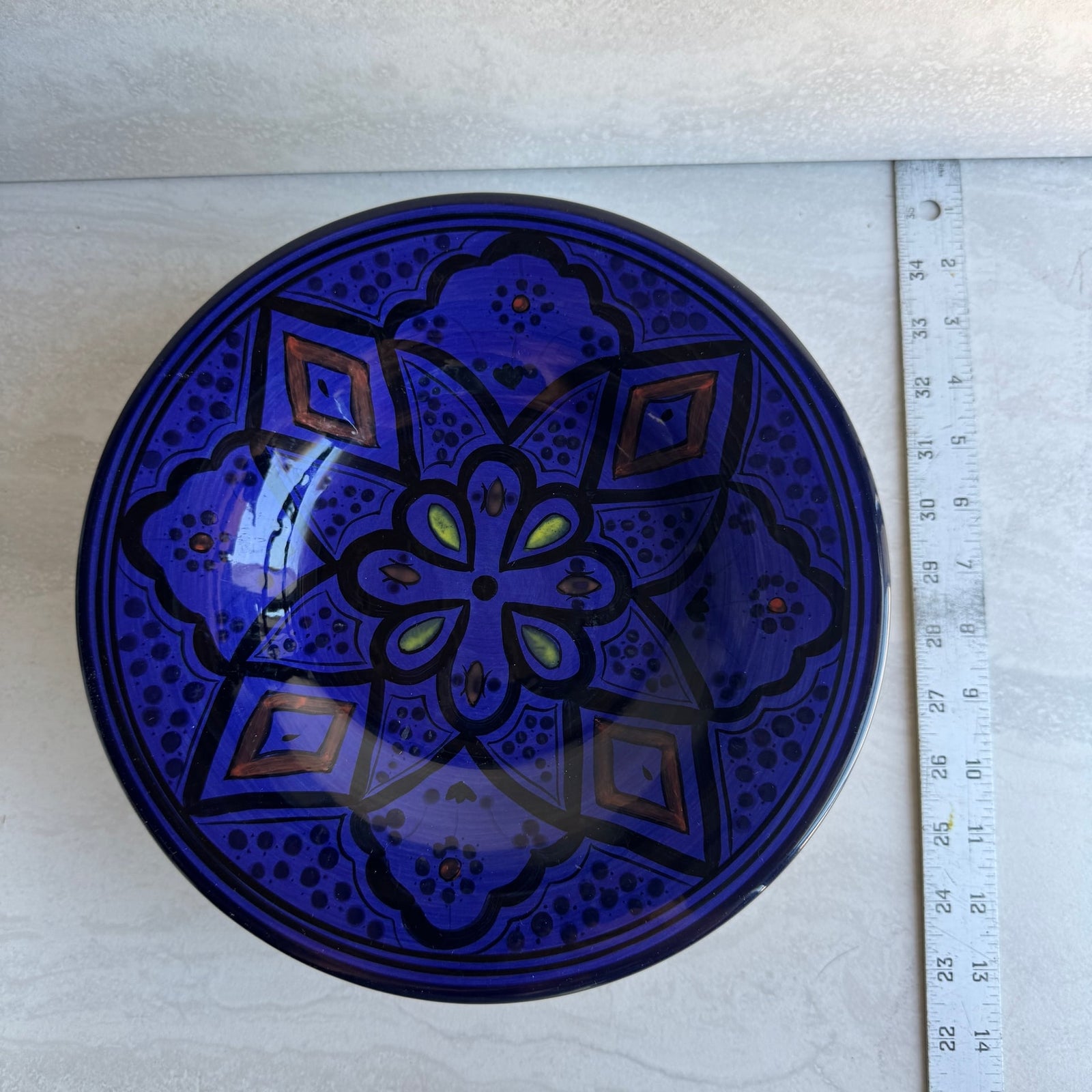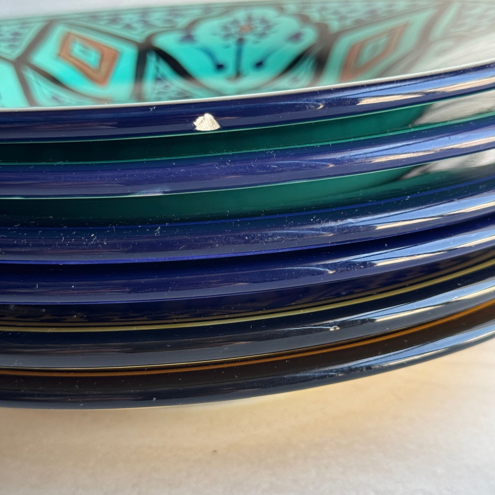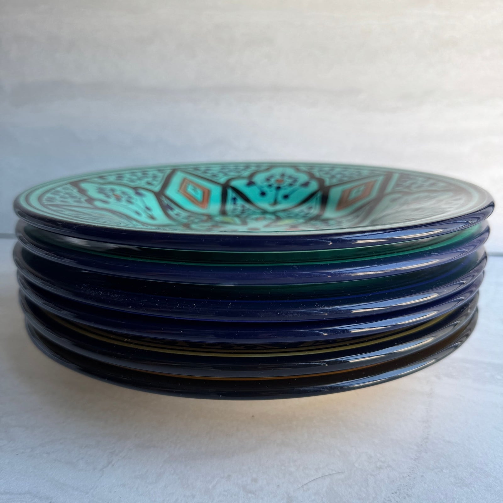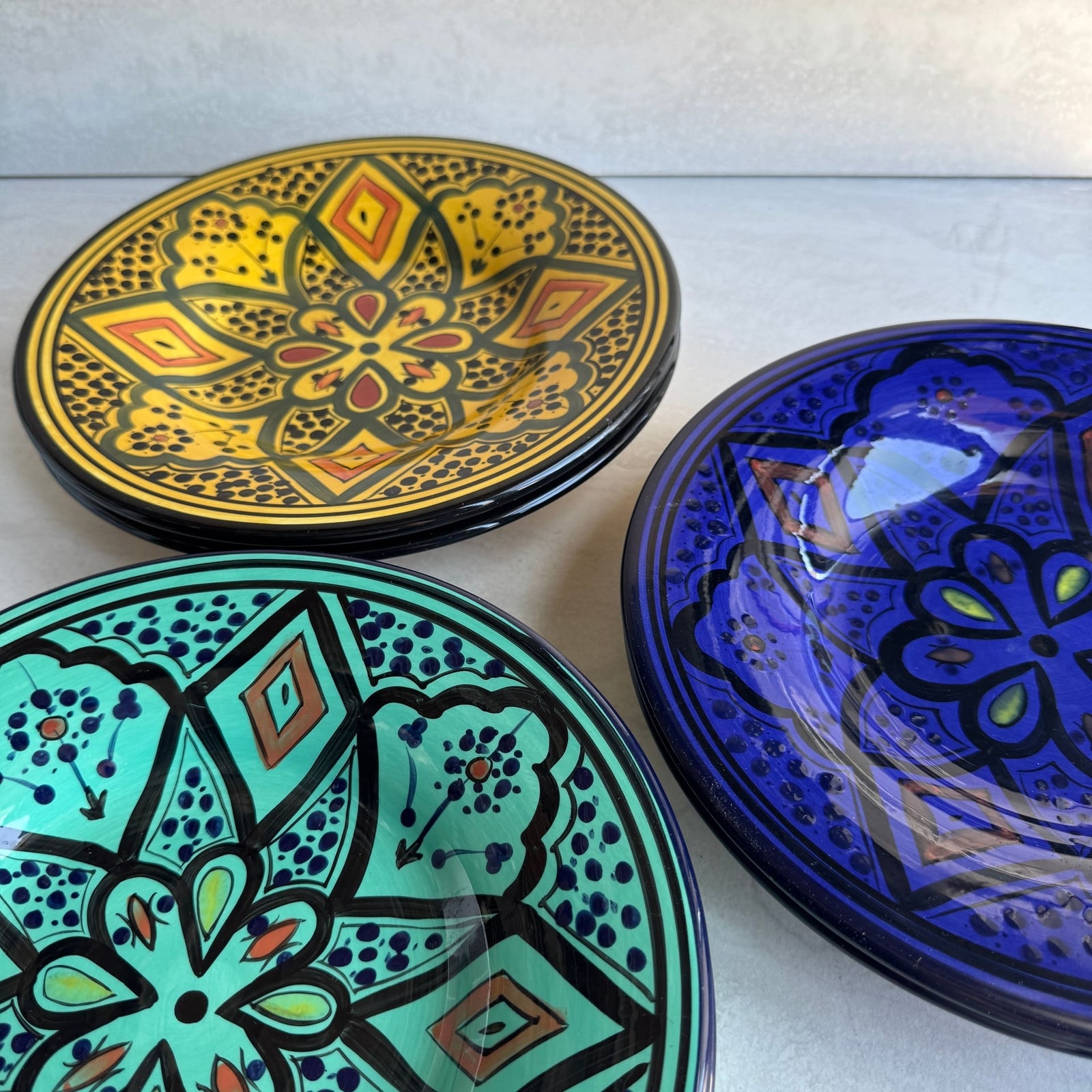 This is a beautiful set hand-painted ceramic bowl, featuring vibrant yellow, green blue, black, and red colors with a striking geometric and floral pattern. This decorative piece can be used as a serving dish or as an accent piece in any room. It is in excellent pre-owned condition with no chips or cracks (one of the 6 plates has a small chip as you can see in the picture. Originating from Morocco, this unique item adds a touch of bohemian flair. Sold as a set of 6.