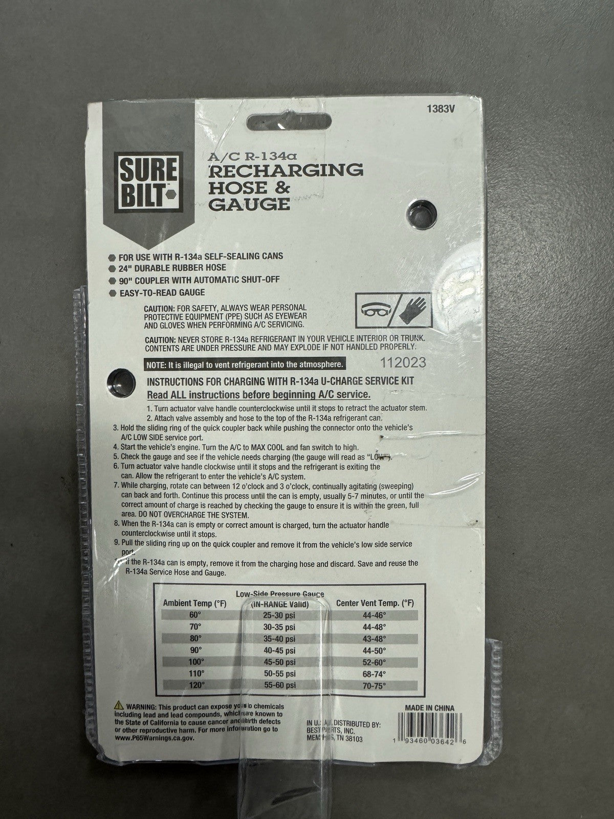The Surebilt A/C Recharging Hose and Gauge is a high-quality automotive tool designed for charging air conditioning systems with refrigerant. Made by the brand Surebilt and featuring a manufacturer part number of LX1383, this tool includes a hose and gauge for easy and accurate filling of A/C systems. Perfect for mechanics and car enthusiasts looking to maintain or repair their vehicle's cooling system, this product ensures a precise and efficient recharge of the refrigerant.
