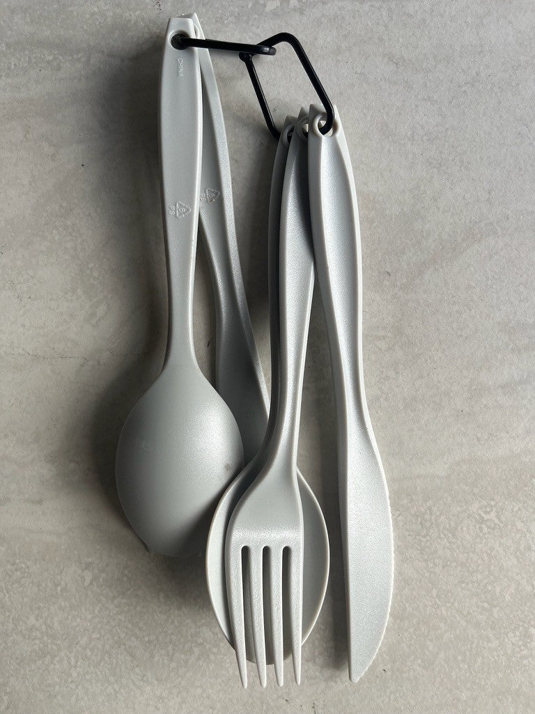The product is a set of 8plastic silverware pieces, including tenedores and cucharas, perfect for all occasions.