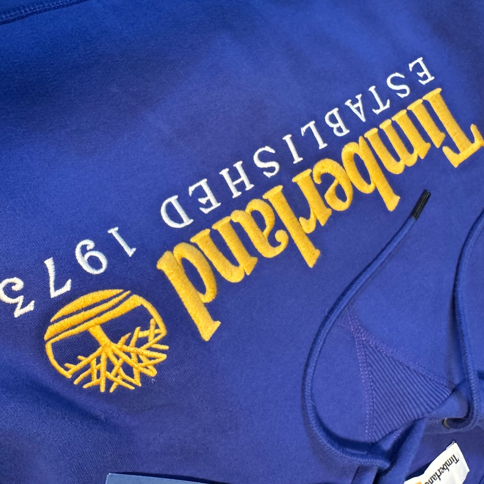 New with tags Timberland men's hoodie in a vibrant royal blue, featuring the iconic Timberland logo and "ESTABLISHED 1973" embroidered in yellow on the chest. This hoodie is perfect for casual wear, providing warmth and style. Excellent condition, brand new, with no flaws.