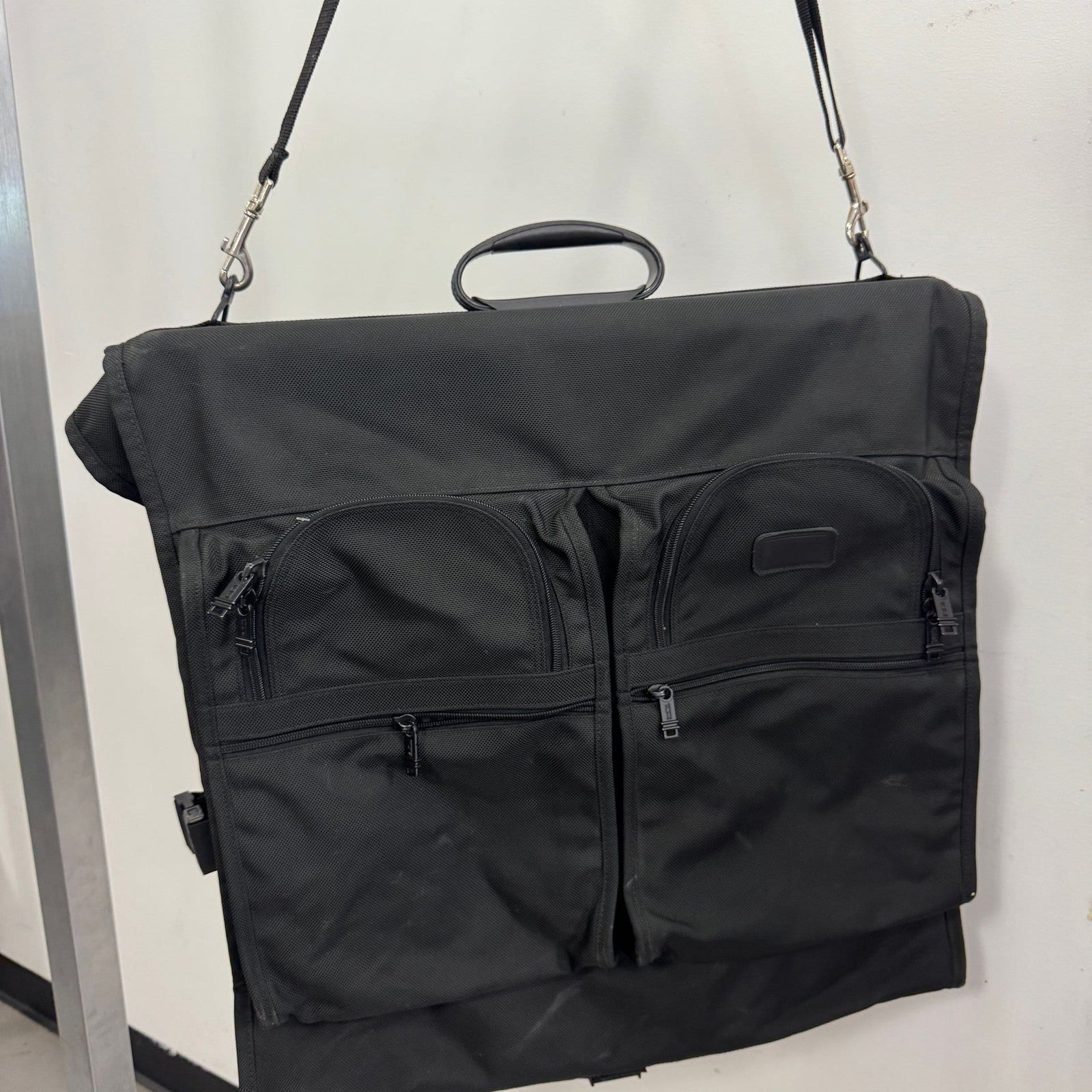 Tumi Alpha Black Ballistic Nylon Bi-Fold Garment Bag - A sophisticated solution for wrinkle-free travel. This durable, pre-owned garment bag is in excellent condition, showing minimal signs of wear. Crafted from Tumi's signature ballistic nylon, it offers unmatched durability and protection for your suits, dresses, and other formal wear.