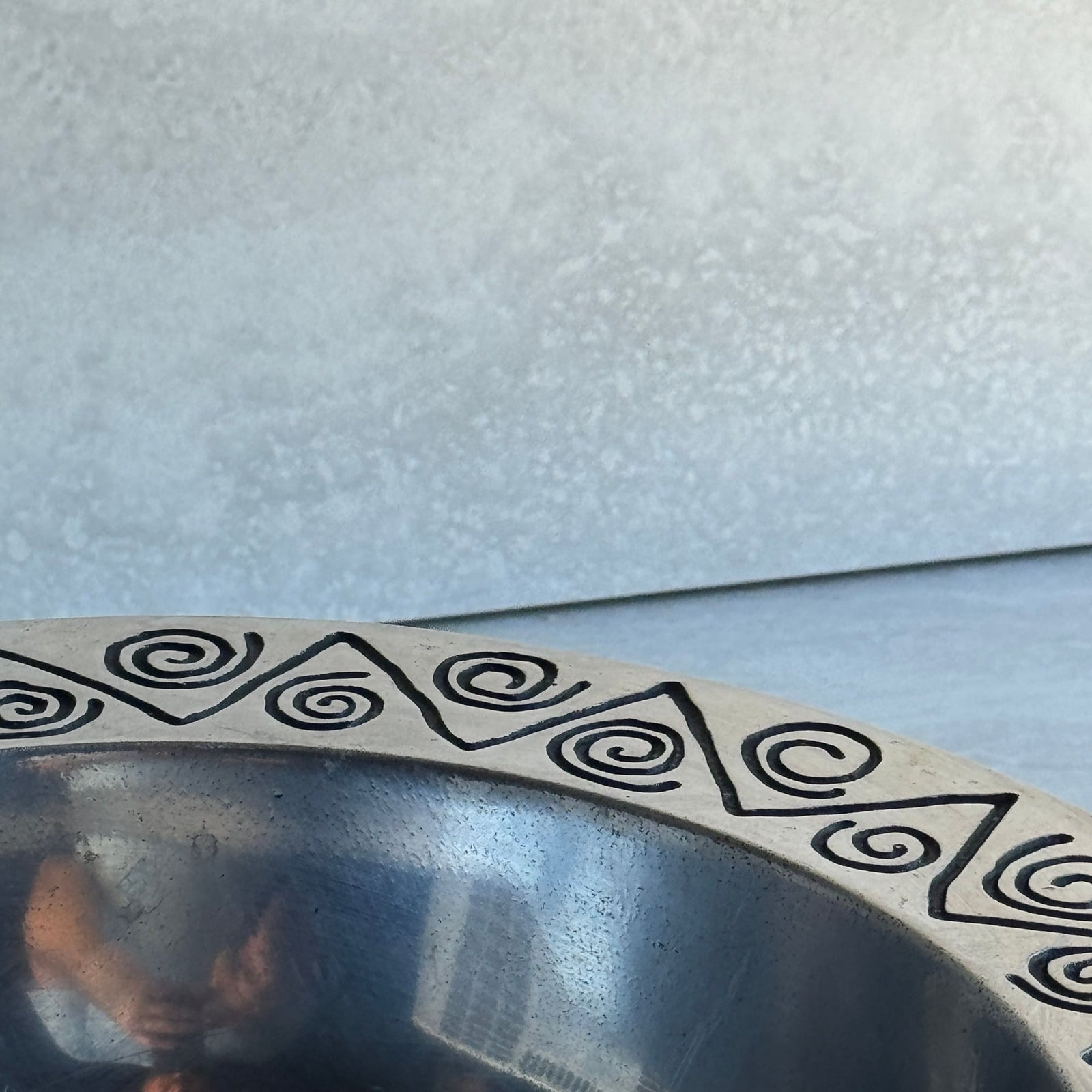 Vintage Wilton Armetale "Reggae" pattern 12" round shallow salad bowl in excellent pre-owned condition. This solid pewter-like metal bowl features etched designs of spirals and jagged lines around the rim, giving it a unique tribal or reggae aesthetic. Perfect for serving salads, fruits, or as a decorative centerpiece. No major dents or damage, just minor surface wear consistent with age. This piece is handmade in the USA, adding to its collectible value and craftsmanship.